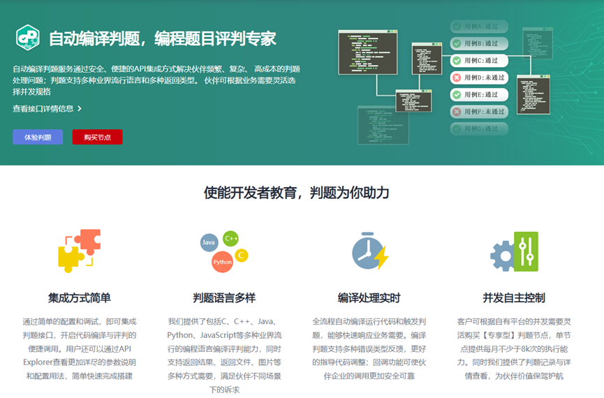 编译判题服务通过安全、便捷的API集成方式解决伙伴频繁、复杂、高成本的判题处理问题,伙伴可根据业务需要灵活选择并发规格。