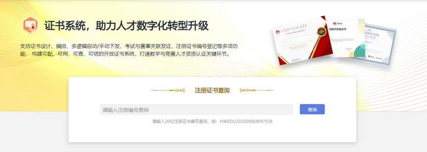 支持电子证书设计、编排、多逻辑自动/手动下发、考试与赛事关联发证、注册证书编号登记等多项功能, 构建可配、可用、可查、可信的开放证书系统,打通教学与竞赛人才资质认证关键环节。