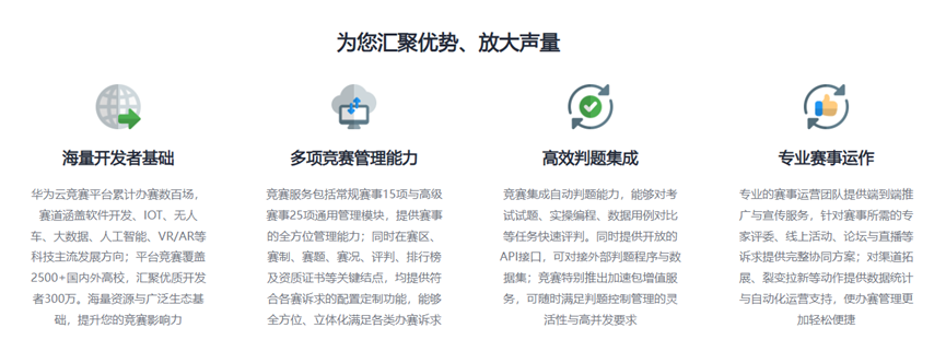 华为云竞赛平台丰富办赛经验沉淀,赛道涵盖软件开发、IoT、无人车、大数据、人工智能、VR/AR等科技主流方向;平台覆盖2500+国内外高等学府,优质开发者数百万。