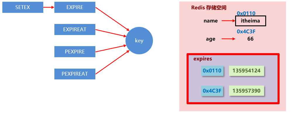 在Redis中,如何给数据设置它的失效周期呢?数据的时效在redis中如何存储呢?看下图: