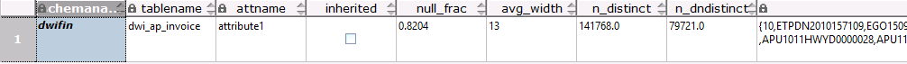 其中是s是视图dwtaxdi.dwi_ap_invoice_i展开后的表dwifin.dwi_ap_invoice,查询此表的列attribute1的统计信息如下,发现在NULL值上存在严重倾斜