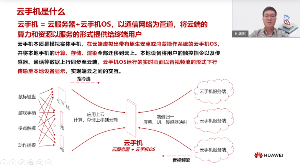 云手机本质是模拟实体手机,在云端虚拟出带有原生安卓或鸿蒙操作系统的云手机OS,并将本地手机的计算、存储、渲染全部迁移到云上。本地设备将用户的触控指令以及传感器、通话等数据上行同步至云端,云手机OS运行的实时画面以音视频流的形式下行传输至本地设备显示,实现端云之间的交互。