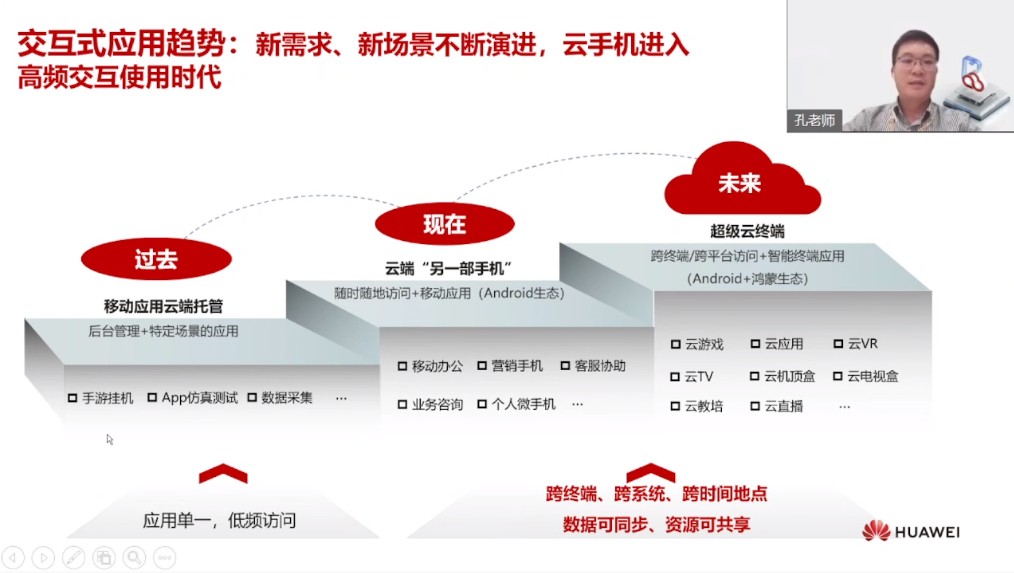 • 手机、Pad、车机等多形态终端访问云手机,应用和数据自动同步,天然支持跨屏式互动体验