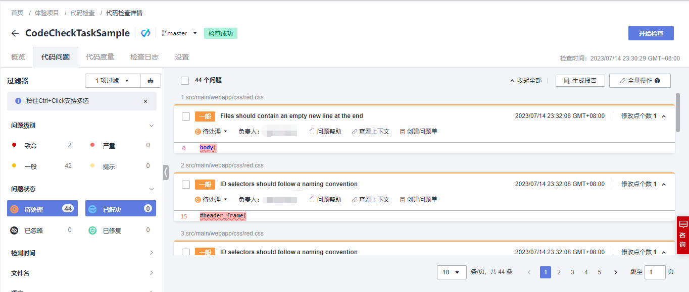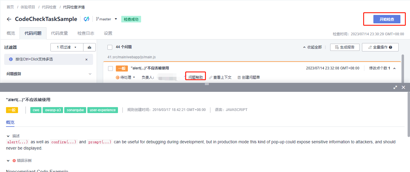 如果在修复问题过程中,有不理解此问题或者需要修复帮助时,可以点击问题下的“问题帮助”查看此告警的详细描述、正确示例、错误示例、修复建议等信息, 在我们修复完所有问题后,可以继续点击“开始检查”按钮检测是否成功修复;
