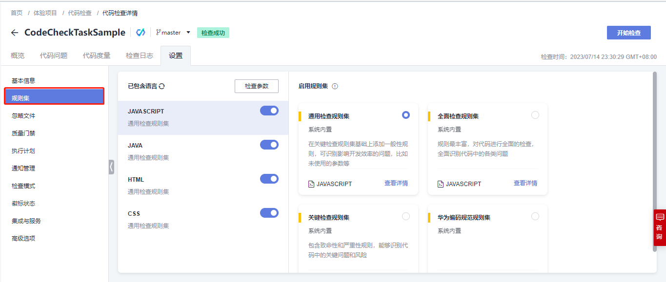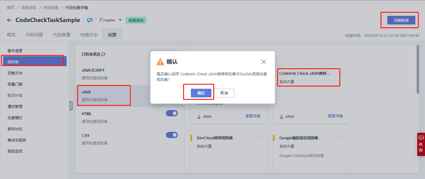 点击左侧JAVA语言查看其包含的所有规则集,可以启用其中的某种规则再次选择“开始检查”来扫描此任务(启用后,默认使用这一种规则集进行扫描):