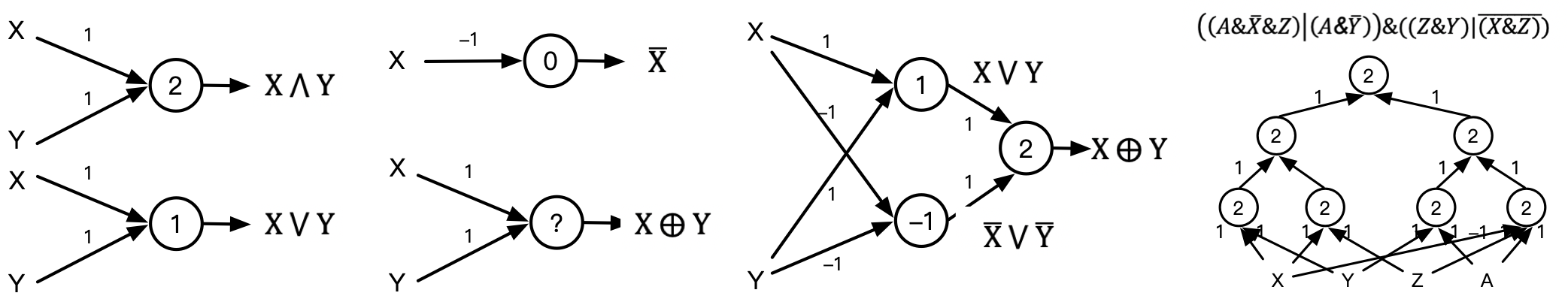 直观地看下一个简单的例子:假设1个圆圈代表一个神经元,那么一个神经元可模拟“与或非”3种运算,3个神经元组成包含1个隐层的神经网络即可以模拟异或运算。因此,理论上,如此组合的神经网络可模拟任意组合的逻辑函数。