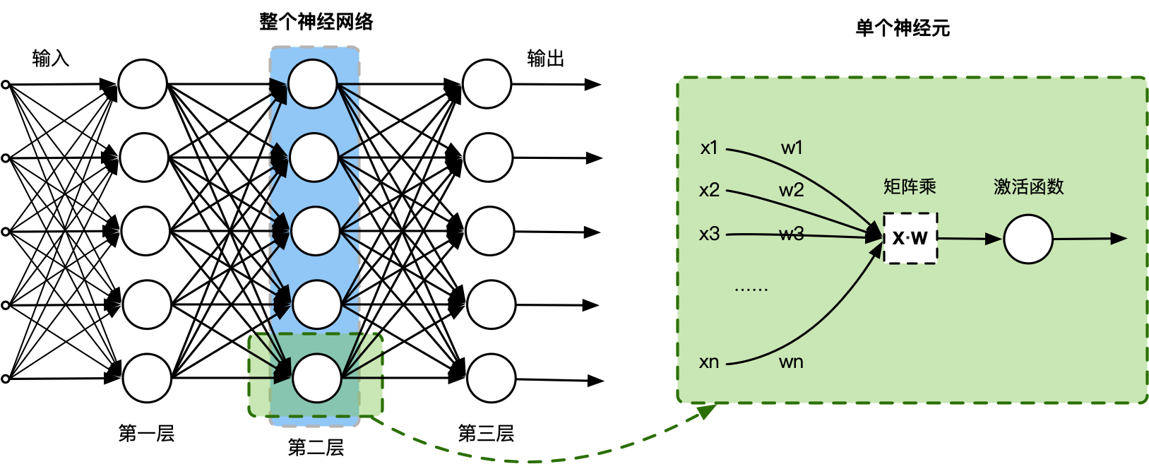 实际上,一个神经网络由多个神经元结构组成,每一层的神经元都拥有多个输入和输出,一层可以由多个神经元组成。例如,第2层神经网络的神经元输出是第3层神经元的输入,输入的数据通过神经元上的激活函数(非线性函数如tanh、sigmod等),来控制输出的数值。