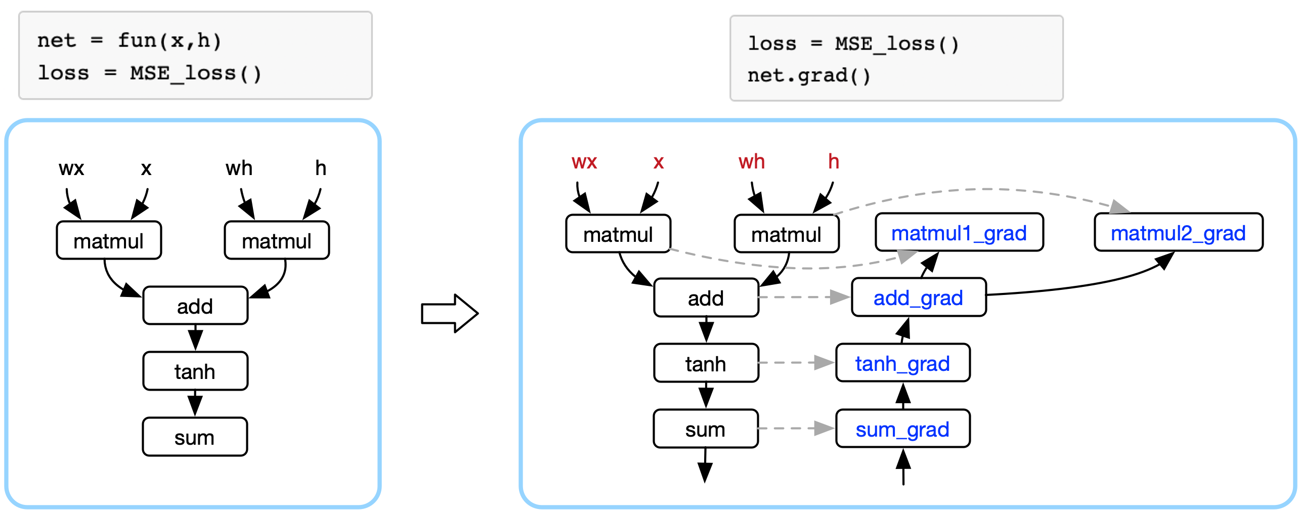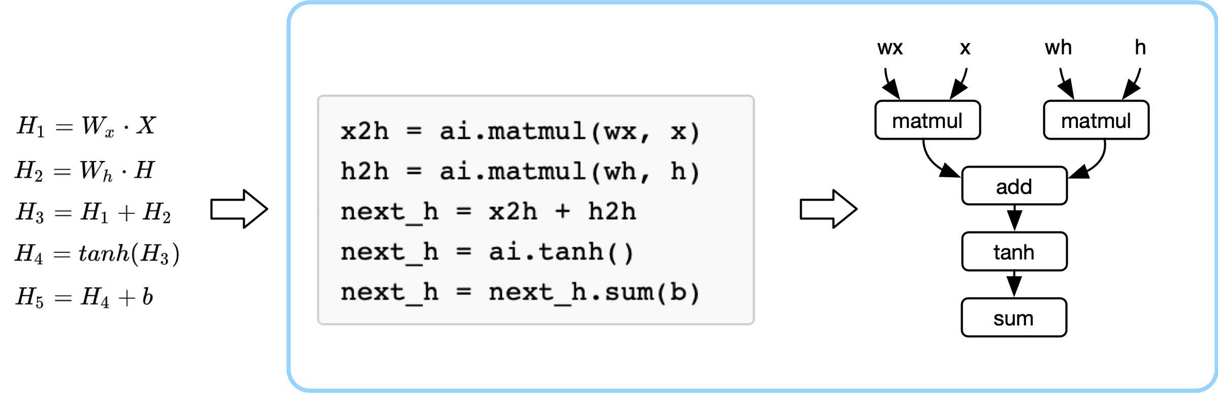 下面左图的公式是神经网络表示的复合函数表示,蓝色框框表示的是AI框架,AI框架给开发者提供构建神经网络模型的数学操作,AI框架把复杂的数学表达,转换成计算机可识别的计算图。
