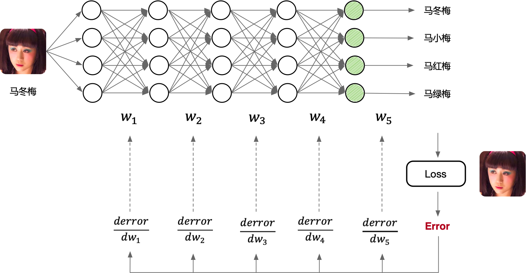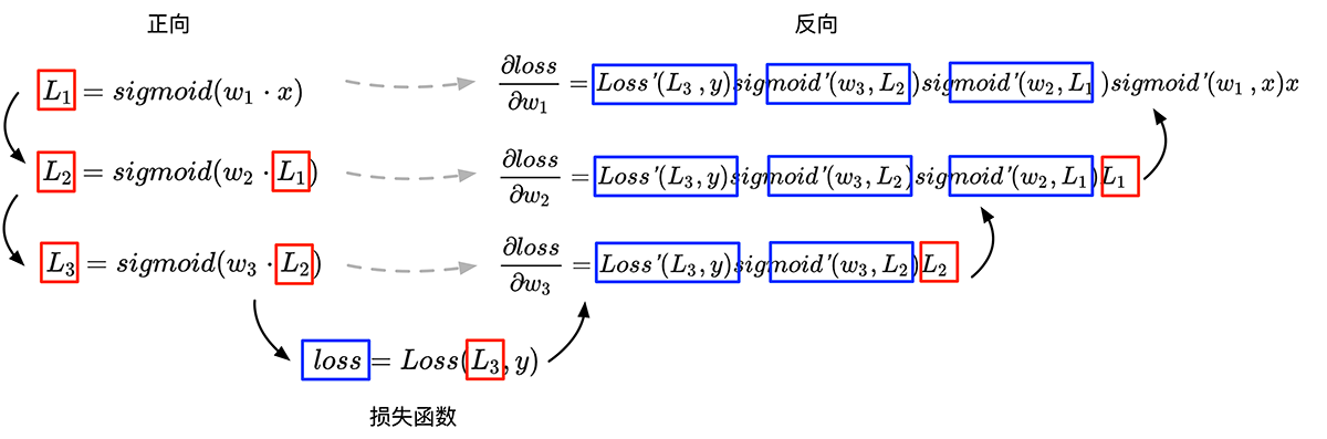 这里的反向,指的是图中的反向箭头,每一次对损失函数中的参数进行求导,都会复用前一次的计算结果和与其对称的原公式中的变量,更方便地对复合函数进行求导。