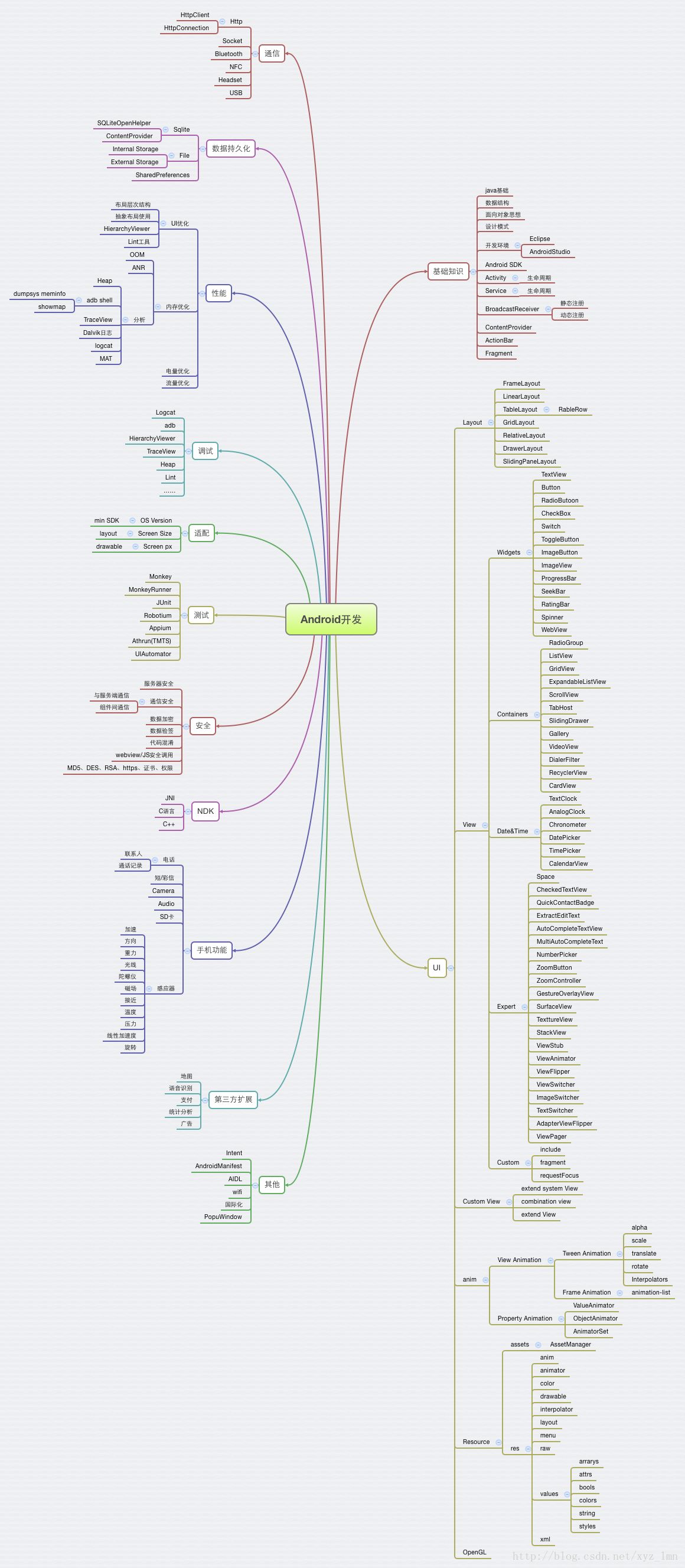 举例:我是做Android开发的,我不会今天去看看C++,明天去学学Python。我首先会选择提升Android开发能力,优先学习Android开发相关内容,本领域学习掌握到一定深度,再去拓宽其他知识面。学习自己领域内知识我会优先汇总整理本专业范围内的知识体系图谱,类似这种: