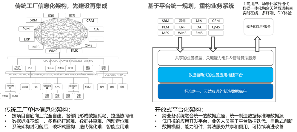 以上是业务视角看到的问题,我们再从技术角度看:传统工厂信息化架构,业务部门“自下向上”先各自建设再集成打通的模式,会造成业务系统之间数据标准不一、数据流动共享难,生产模式或工艺类型一旦发生大的变化,传统信息化架构的软件系统只能破坏式重构,无法做到柔性化。