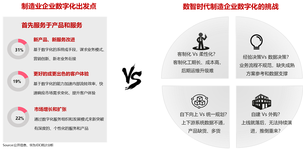 根据华为IDC调研统计分析和一些公开的信息,制造企业数字化建设的出发点是通过数字化的系统或手段,加速企业内部的信息流转效率和准确性,首先服务于改进产品和服务,帮助企业的生产制造业务流程能快速响应客户需求、提升客户体验,实现“高质量、低成本、快交付”,持续支撑市场增长和业务扩张。