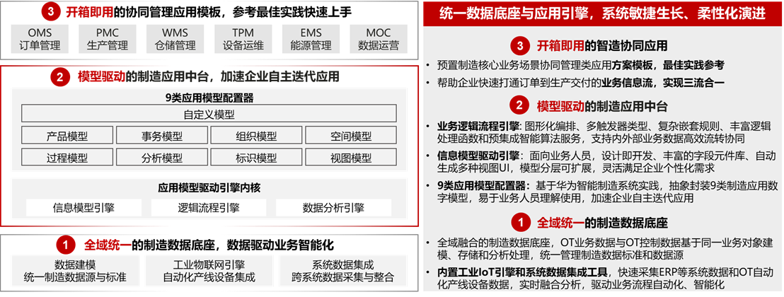 9类模型:基于对华为智能制造实践的抽象封装,打造了9类工厂应用模型配置器,支持企业开发者或者行业伙伴通过图形化配置的方式,就能快速生成与调整面向不同细分行业的生产管理系统,经过实践证明业务应用的搭建周期由原本的按月到按周迭代,整体上线周期能够加速3倍以上。9类应用模型配置器支持在行业/企业和组织站点3个层级进行扩展与调整,来灵活满足不同行业不同企业不同工艺流程对生产管理系统的个性化需求,大大降低中小制造企业建设生产数字化系统的实施和运维成本。