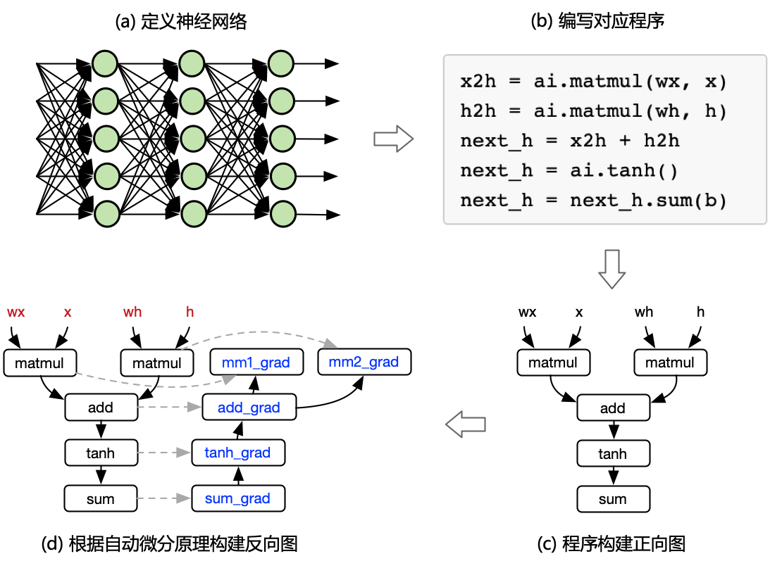 在前面的内容主要是讲述了AI框架在数学上对自动微分进行表达和处理,最后表示称为开发者和应用程序都能很好地去编写深度学习中神经网络的工具和库,整体流程如下所示: