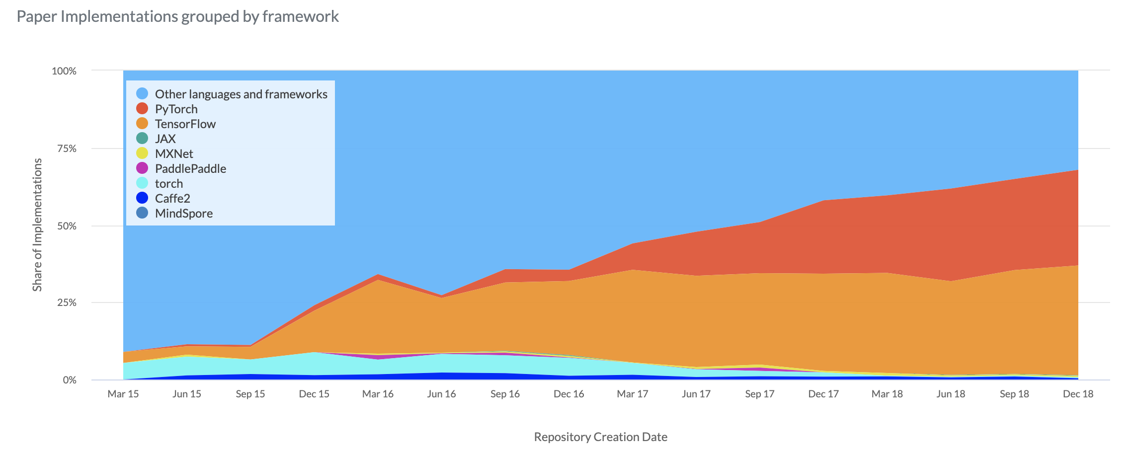 2016年 Google 开源了 TensorFlow 框架,Facebook AI 研究团队也发布了基于动态图的AI框架 PyTorch,该框架拓展自 Torch 框架,但使用了更流行的 Python 进行重构整体对外 API。Caffe 的发明者加入了 Facebook(现更名为 Meta)并发布了 Caffe2 并融入了 PyTorch 的推理生态;与此同时,微软研究院开发了 CNTK 框架。Amazon 采用了这是华盛顿大学、CMU 和其他机构的联合学术项目 MXNet。国内百度则率先布局了 PaddlePaddle 飞桨AI框架并于 2016 年发布。