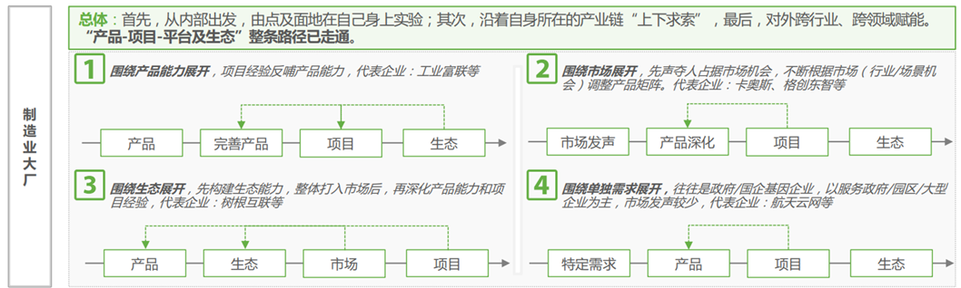不少大型企业已经开始成立产业化组织,将数字化经验能力产业化外溢输出到相关上下游行业的中小规模企业,提供数字化产品方案和服务。部分制造业大厂,比如海尔、三一、徐工、美的、TCL、华为等,企业数字化转型成果已经走完由“自建自用”到“产品化外溢输出-构建平台及生态”的产业化之路,暂时领先于互联网大厂、ICT企业等其他产业玩家,在最新的国家级双跨平台评选中,来自制造大厂的“工业互联网平台”排名也整体相对领先。