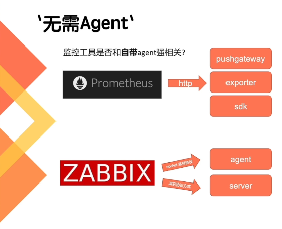 如果使用Prometheus去监控Linux或者Kafka,或者其他一些应用中间件或者服务器,可能要去部署agent。例如,监控kafaka就需要部署 kafaka gmx exporter,类似于agent的Exporter;监控Linux就需要一个Linux Exporter。Prometheus自带的exporter 和 agent是绑定在一起的这个关系