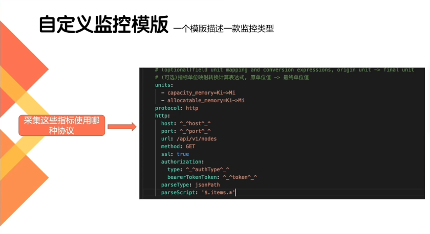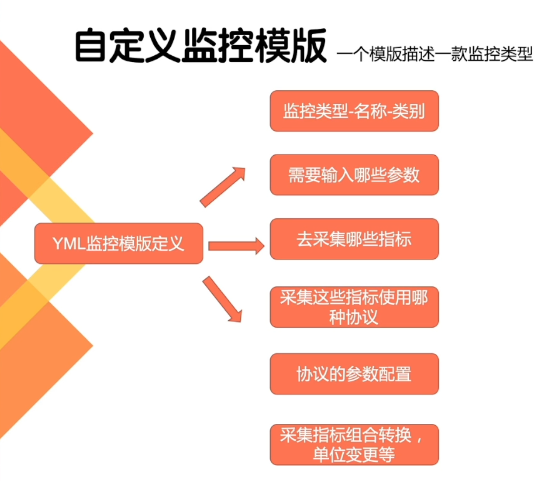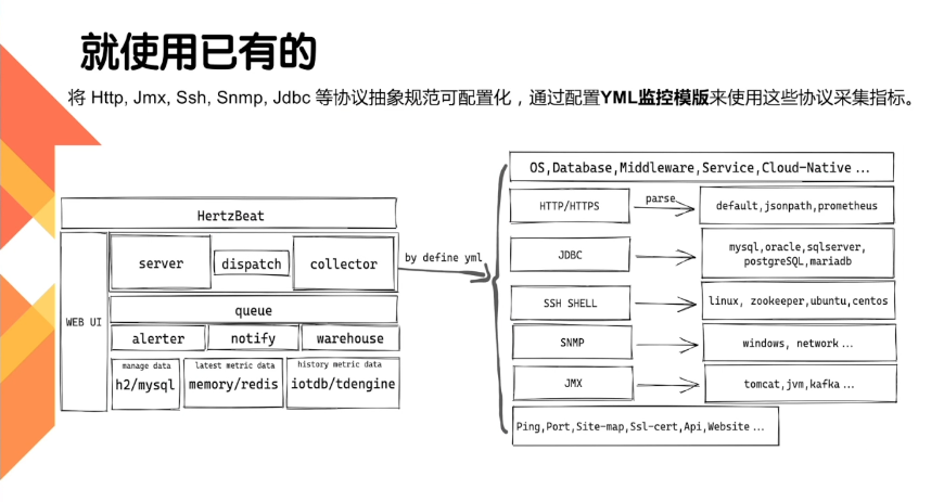 将 Http,Jmx,Ssh,Snmp,Jdbc等协议抽象规范可配置化,通过配置YML监控模板来使用这些协议采集指标