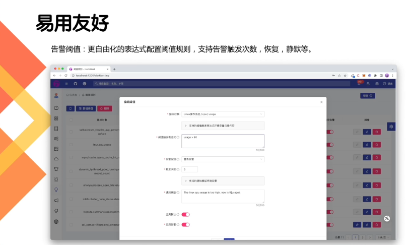 告警阈值:更自由化的表达式配置阈值规则,支持告警触发次数,恢复,静默等