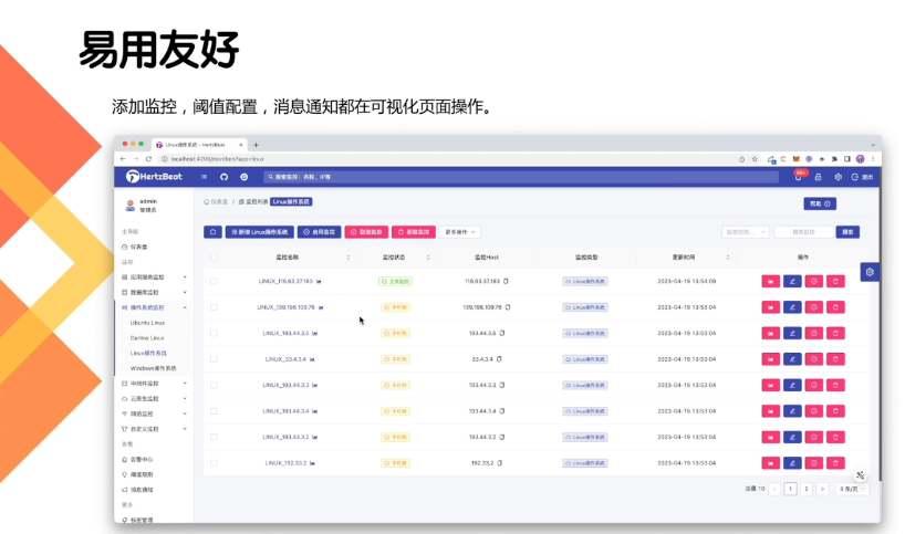 作为一个开源项目,我们想把它做成一个简单易用的产品。因此,添加监控、阈值配置、消息通知都可以在可视化页面进行操作(无需使用YAML进行配置,配置之后也无需重启)