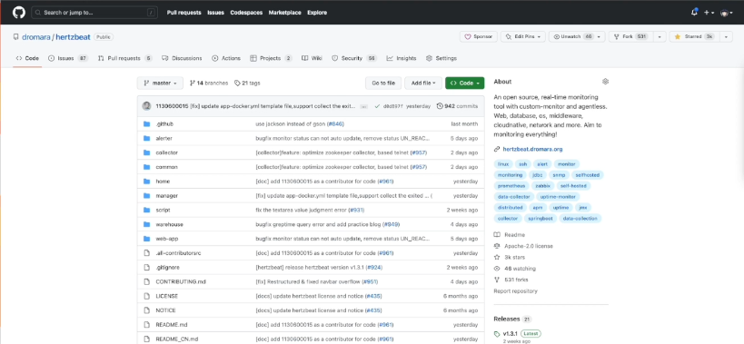 这是hertzbeat在Github 仓库上的源码,欢迎大家到Github三连一下,或者提一些Issues