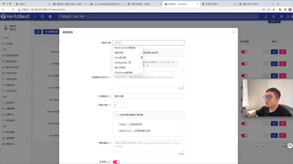 这里可以配置它的阈值规则,比如配置网站消息“网站检测”。可以配置“阈值触发表达式”、“通知模板(消息该发送给哪些人)”等