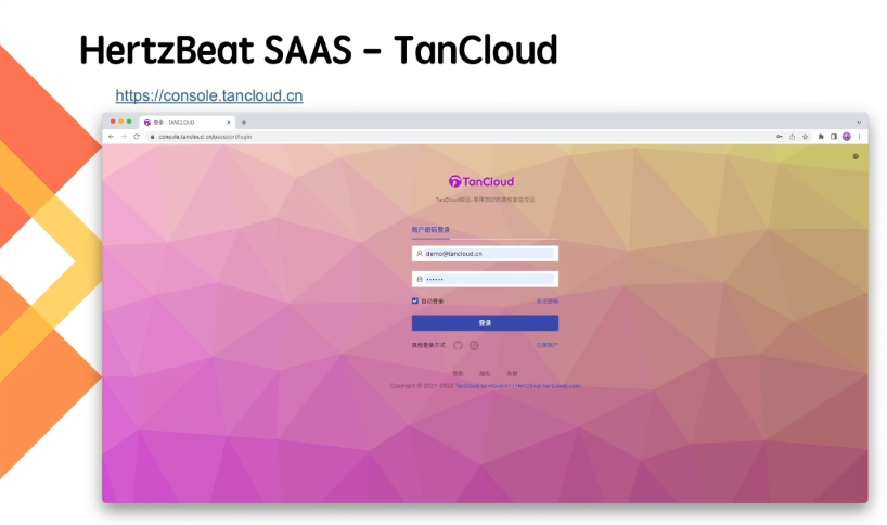 TanCloud是基于HertzBeat 去构建的一个云服务SAAS。定位是一个易用、友好的、高性能、分布式监控的一个环境。网址是https://console.tancloud.cn