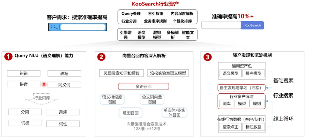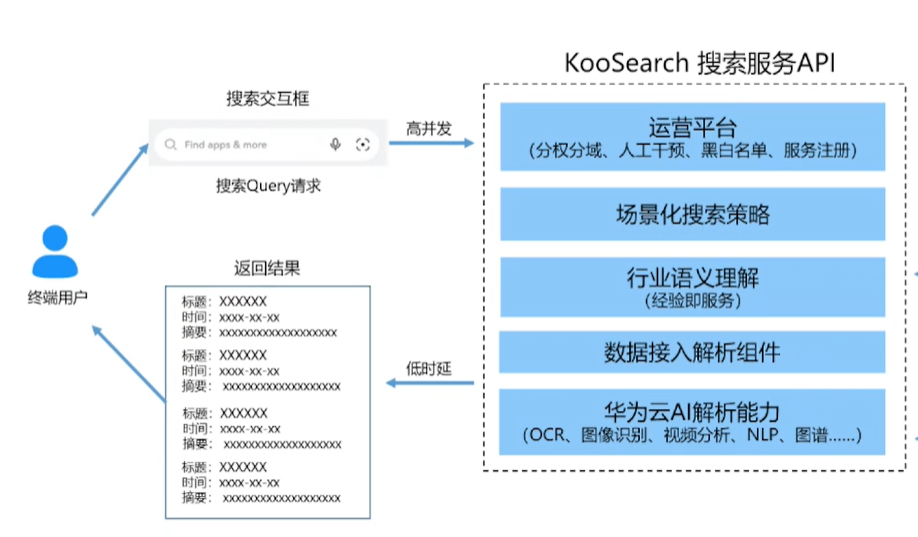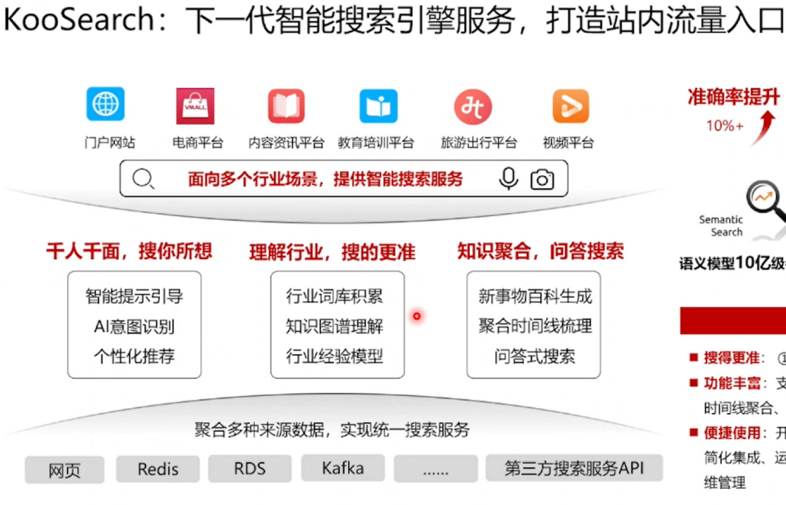 KooSearch是华为云推出的一款全托管的搜索服务。它主要为企业内部办公、客户站内搜索等业务提供支持,通过内置的行业分词、语义理解、行业排序算法等能力,帮助客户实现更简单、更准确、更快速的搜索服务。