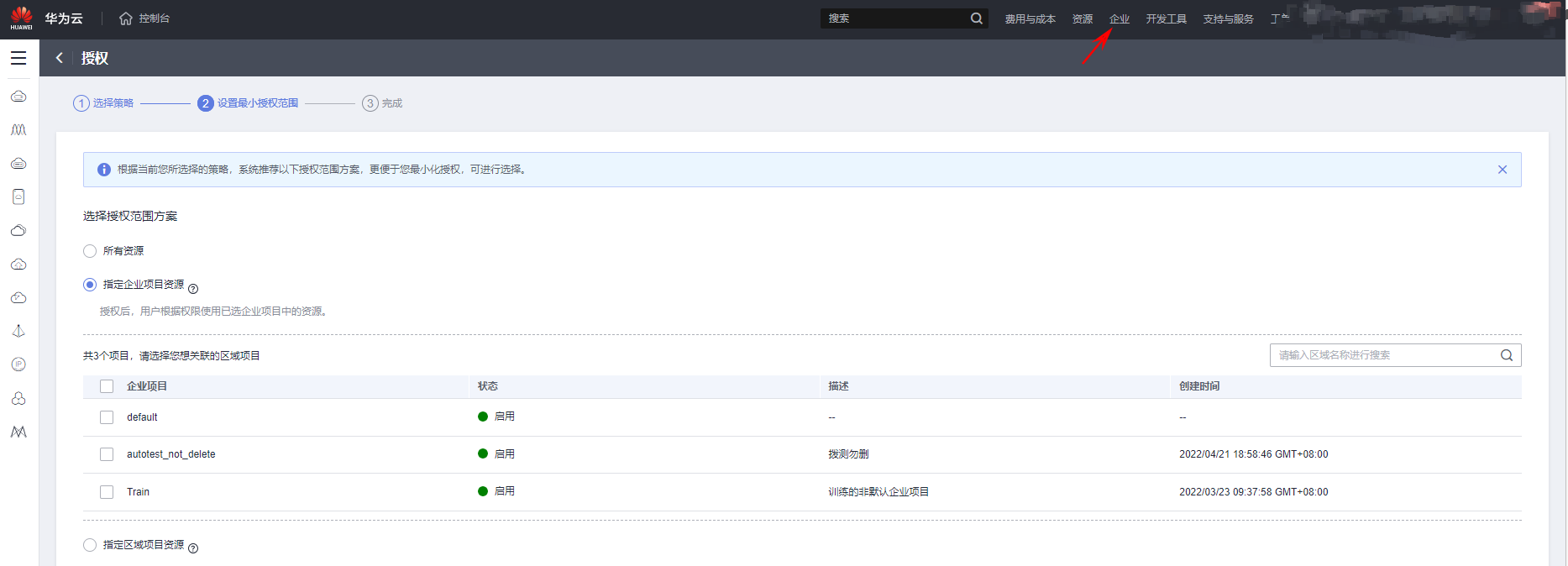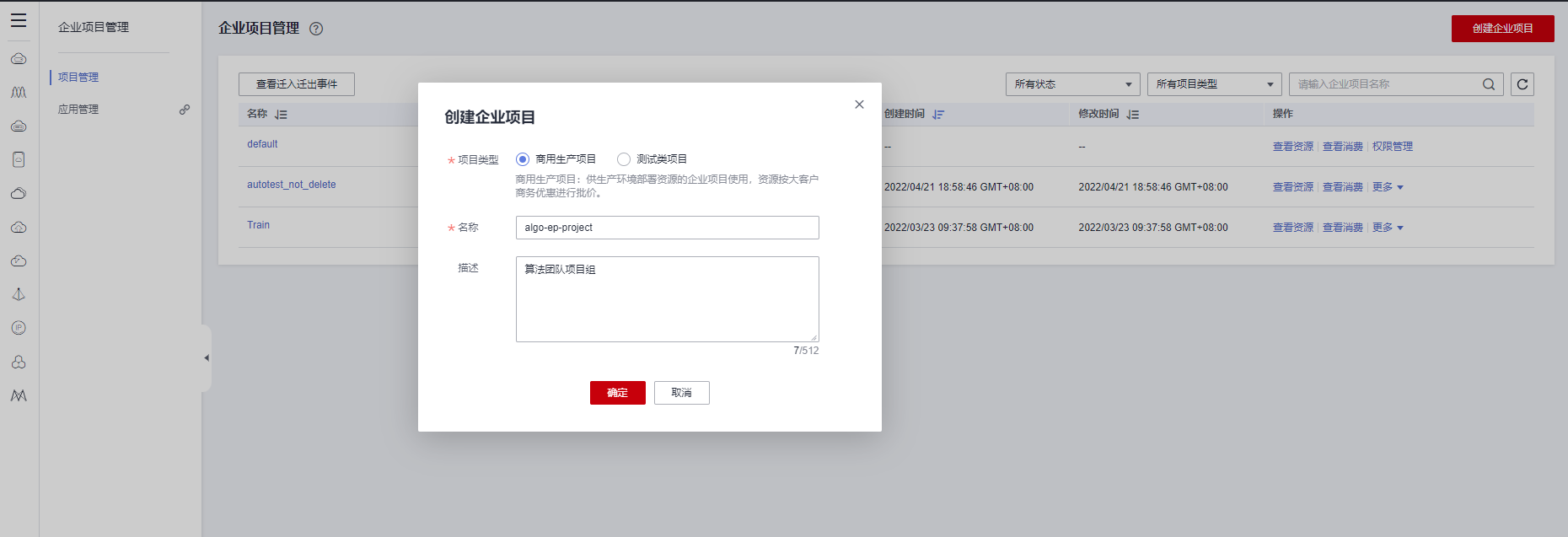 注意:此处的企业项目应指定为算法团队的企业项目。