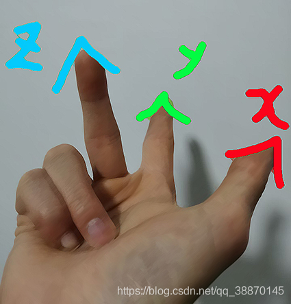 右手大拇指指向X轴,食指指向Y轴,中指指向Z轴。