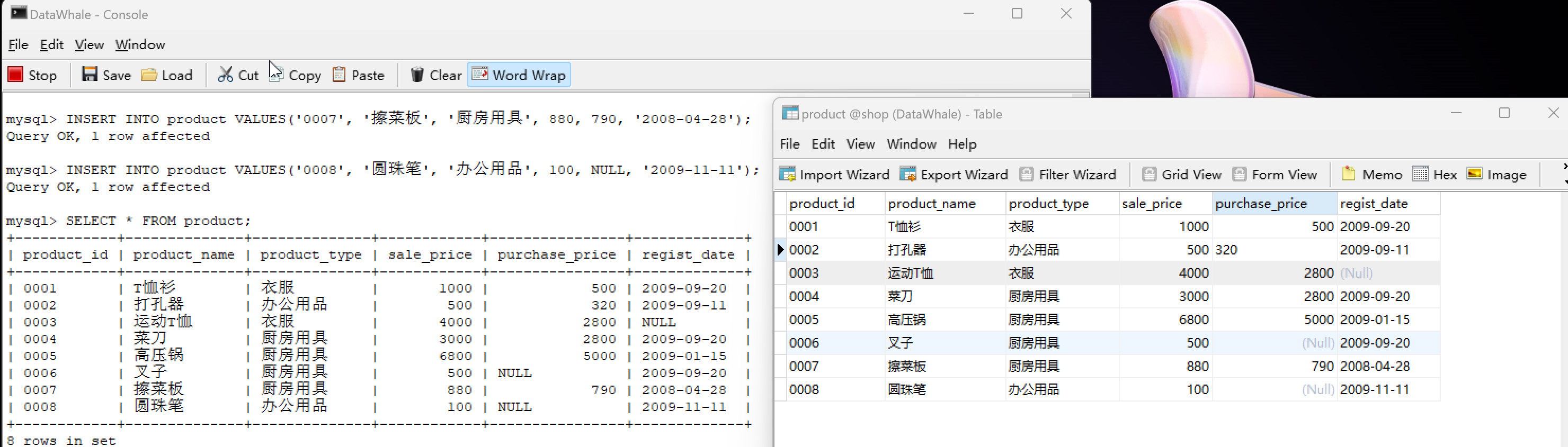 我们打开 navicat lite,连接数据库并按 F6 打开 Console 命令行终端,先创建 shop 数据库和 product 表,并插入数据:
