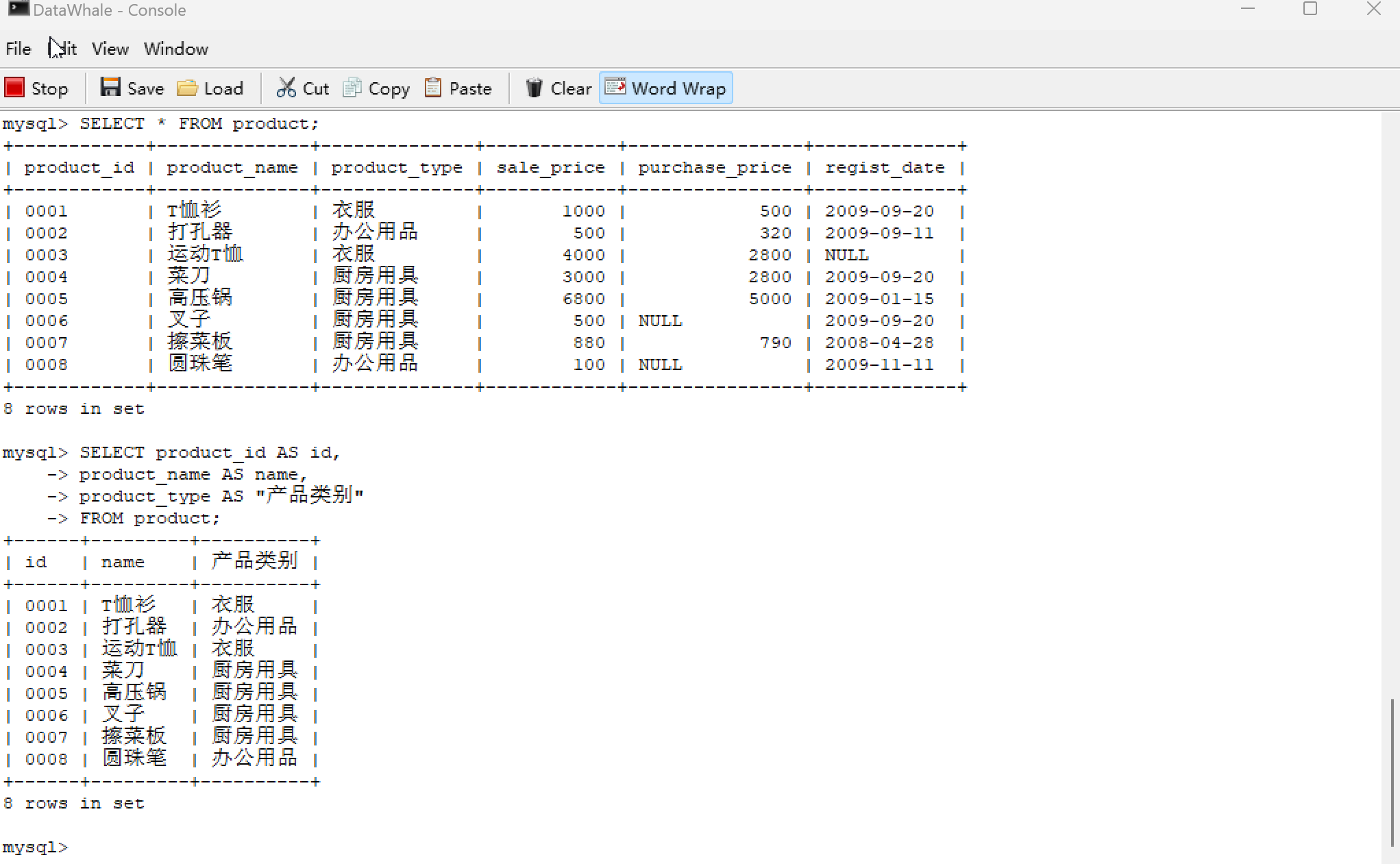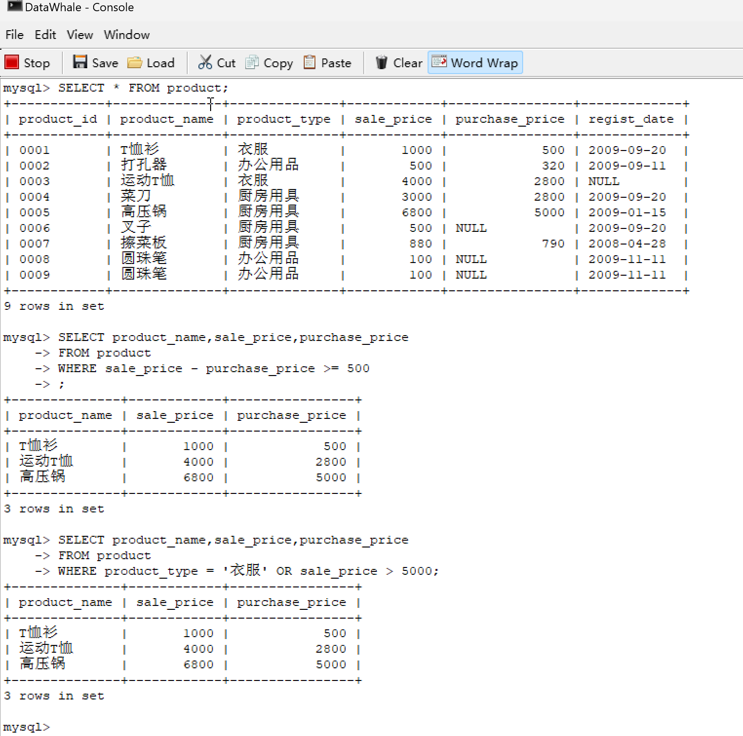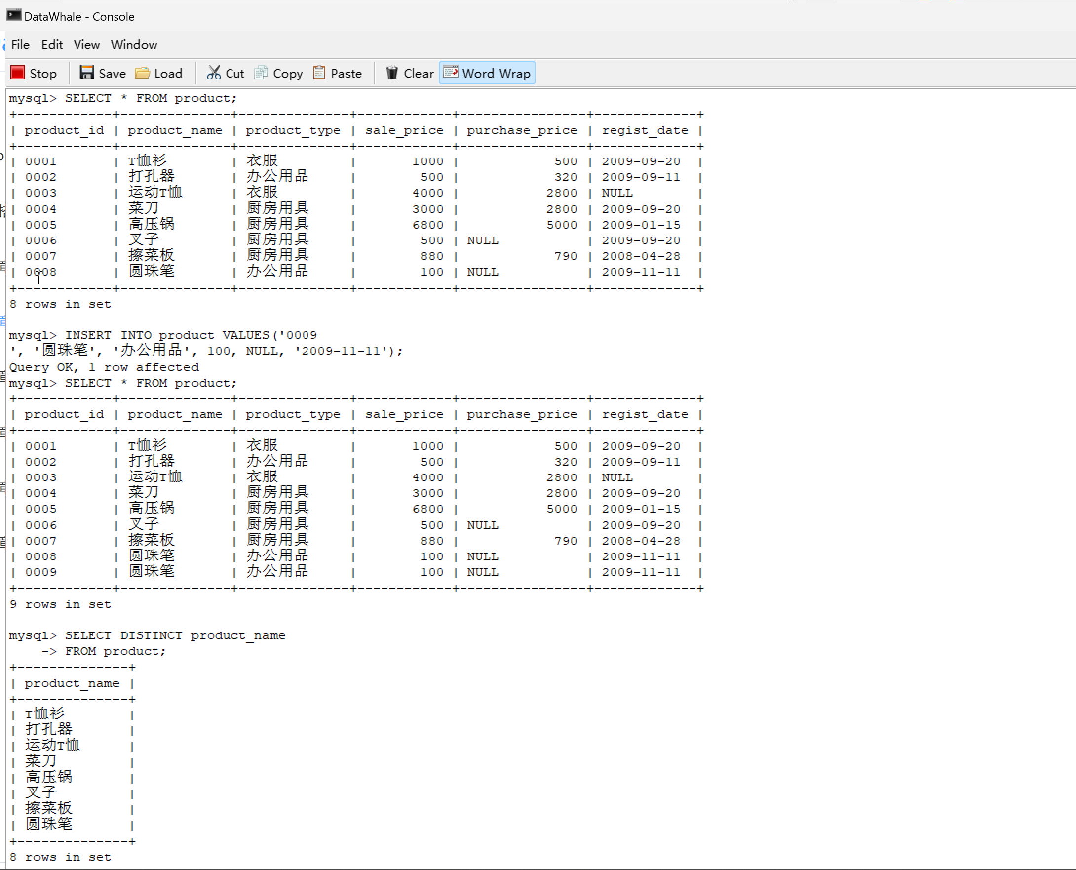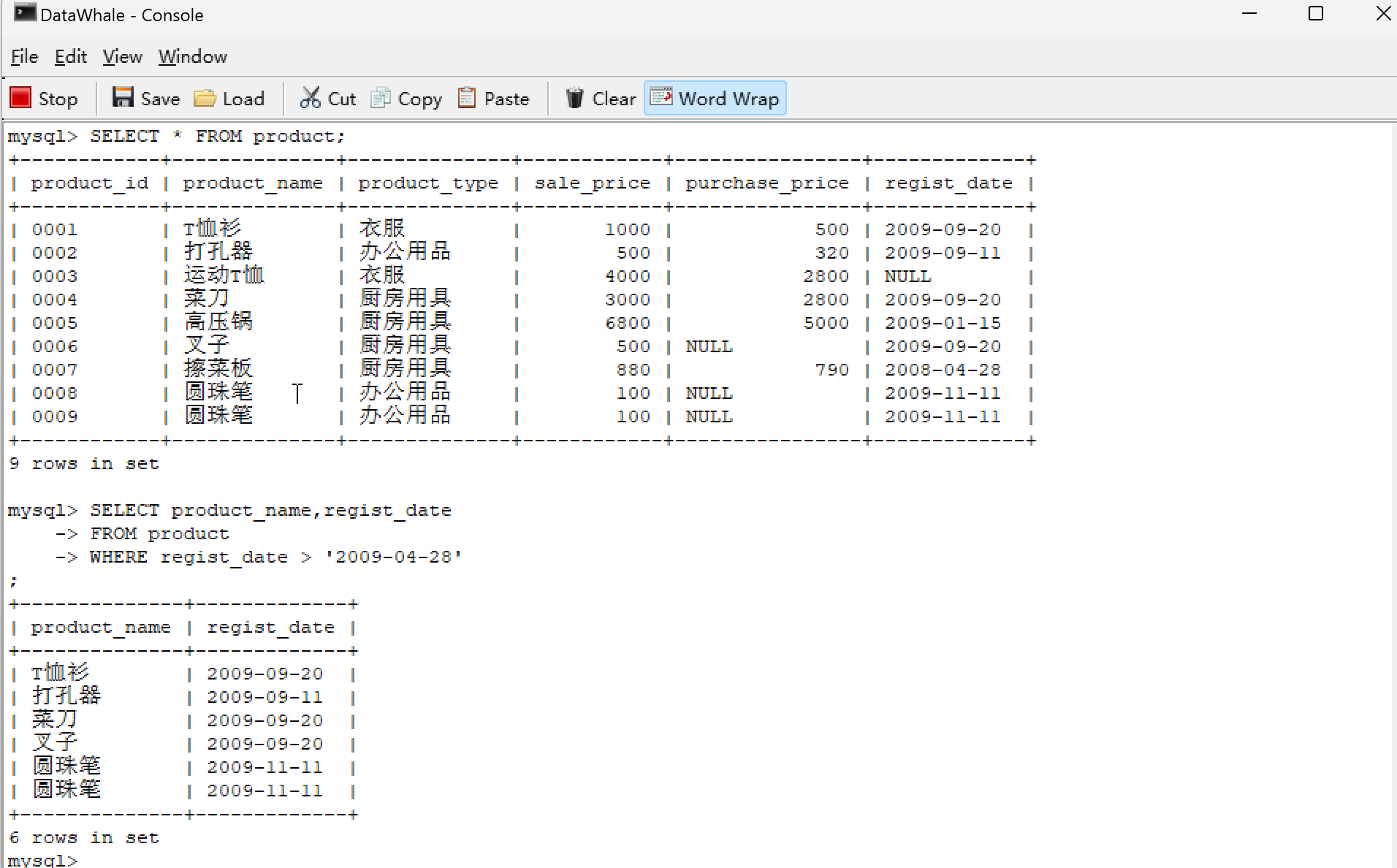 | 0001 | T恤衫 | 衣服 | 1000 | 500 | 2009-09-20 |