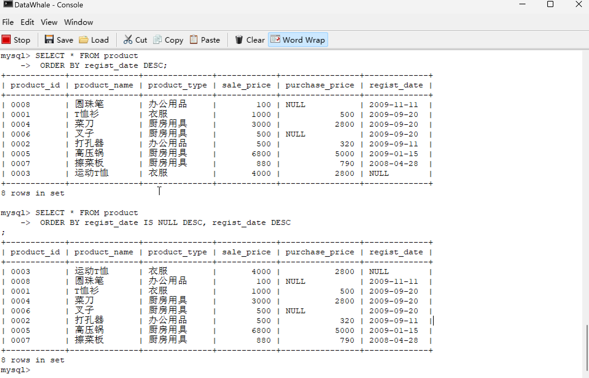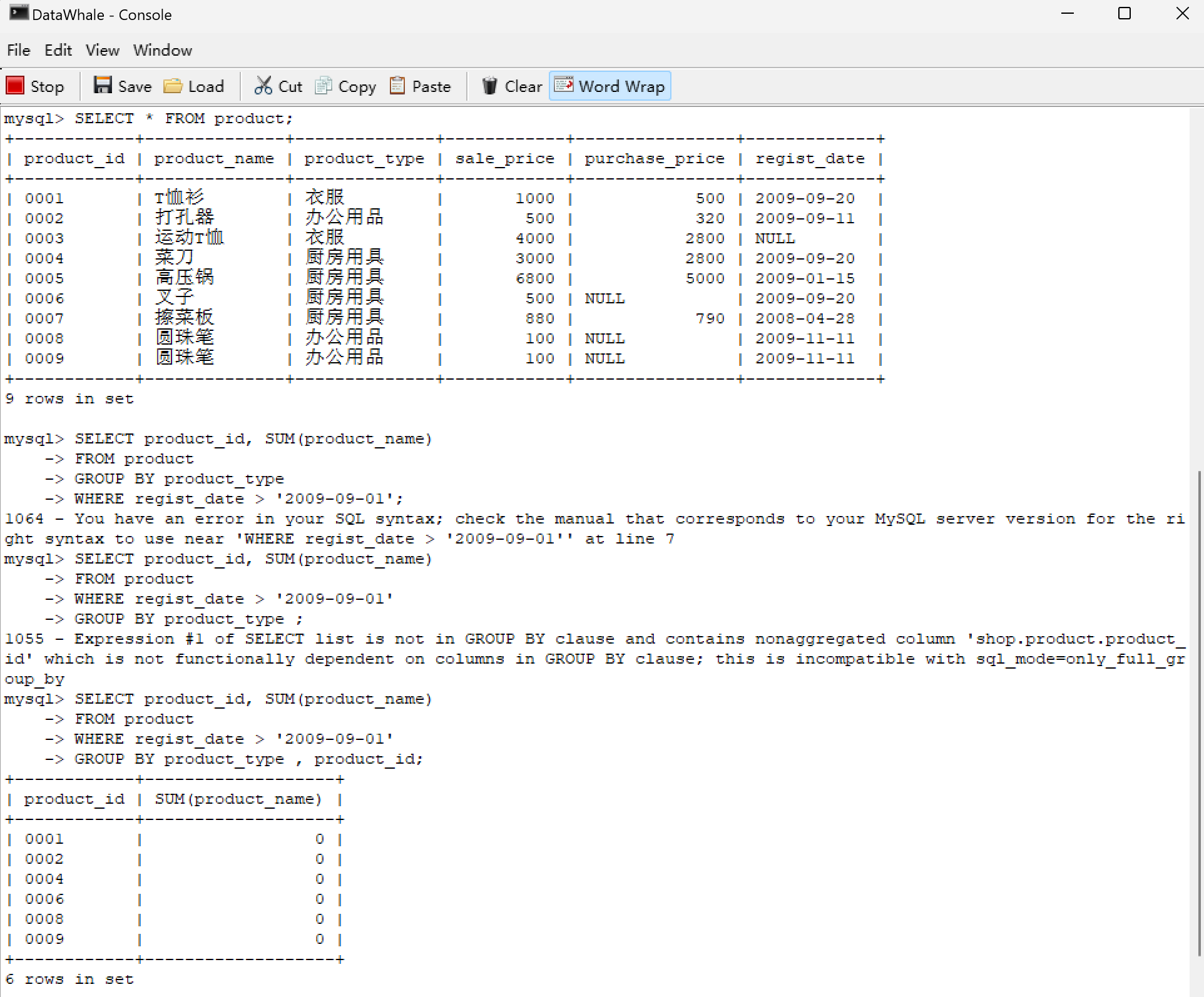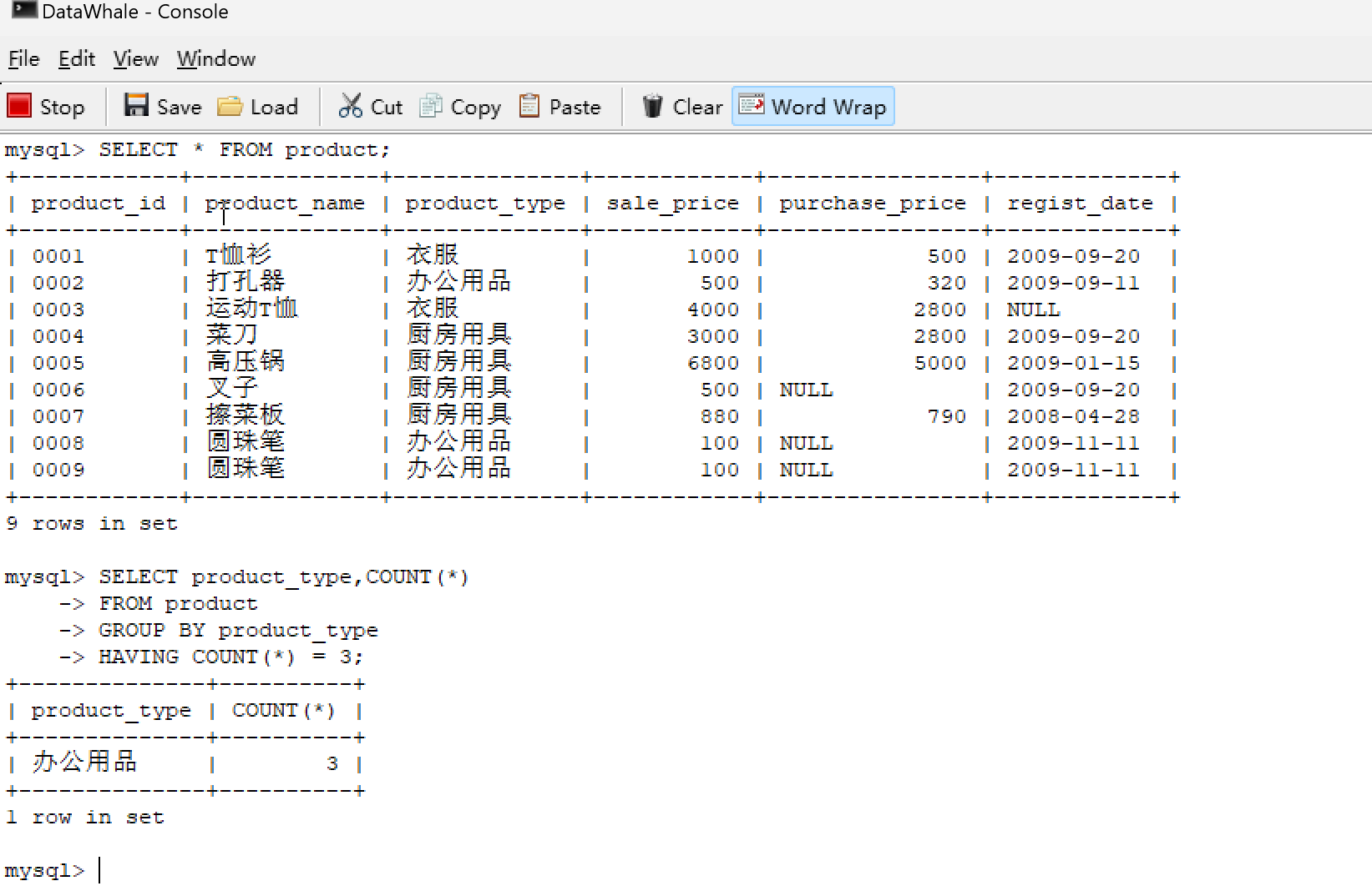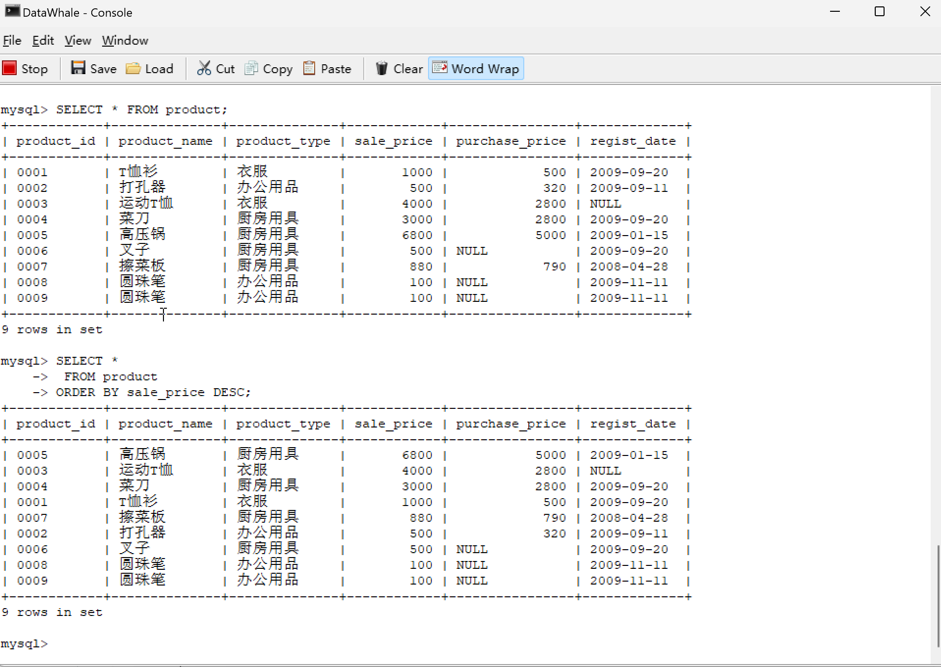 | 0001 | T恤衫 | 衣服 | 1000 | 500 | 2009-09-20 |