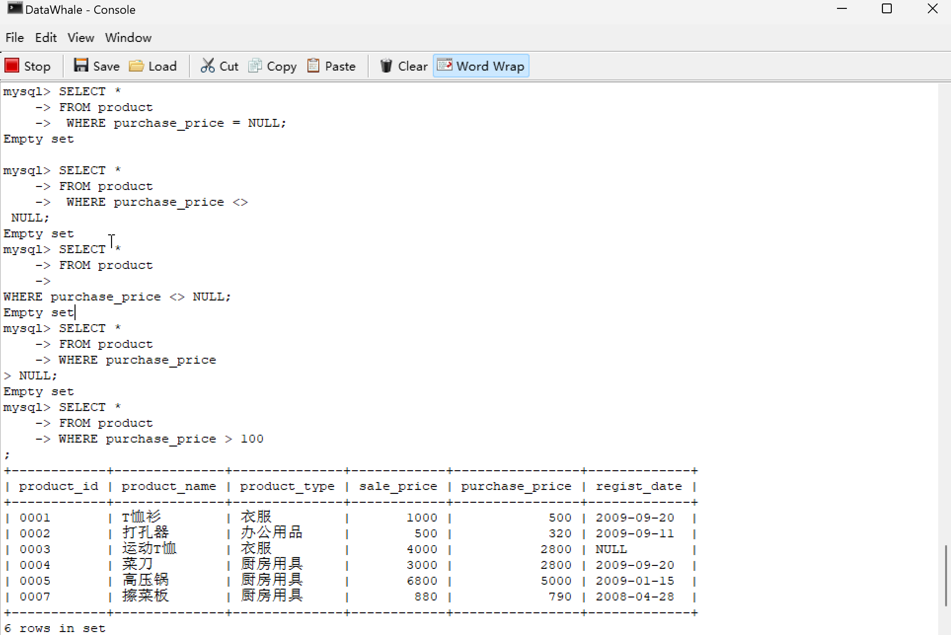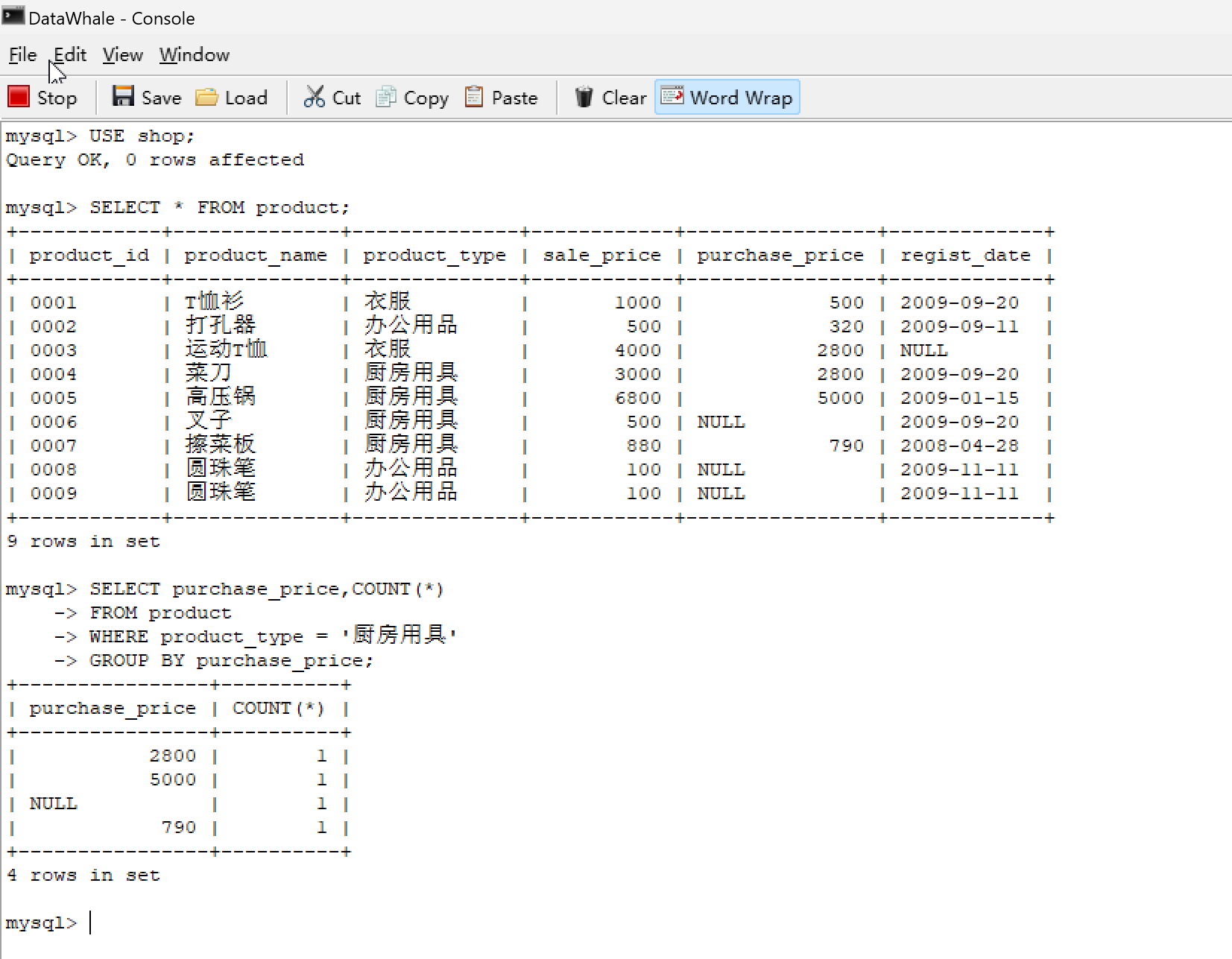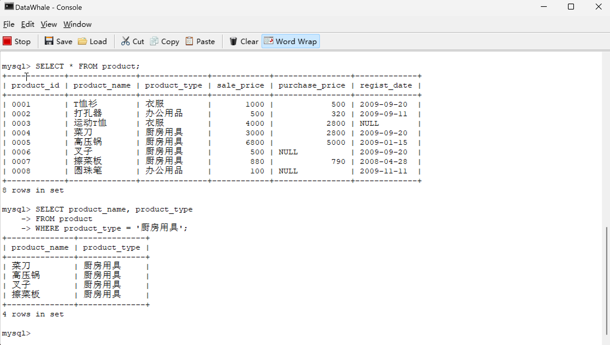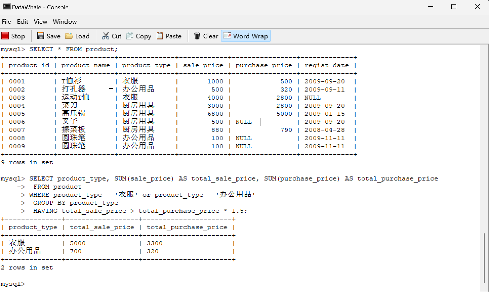 | 0001 | T恤衫 | 衣服 | 1000 | 500 | 2009-09-20 |