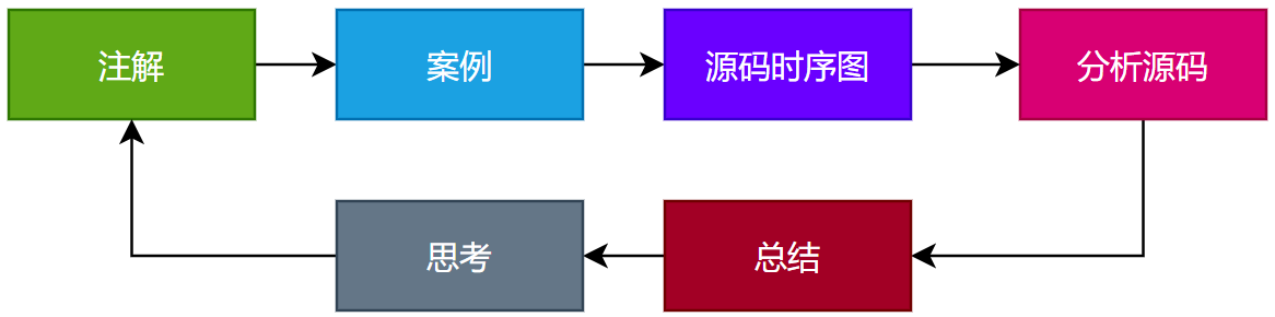 聊完宏观的总体规划,我们再来谈谈微观层面对每个章节具体内容的布局。其实,关于每个章节的布局,前面多少已经提到过了,就是 以最新的Spring6为基础,以Spring中的核心注解为入口,给出实用案例,通过对应注解在Spring源码层面执行的时序图,引导小伙伴有针对性的去看源码,去分析源码,最后总结和思考,形成总体上的闭环。