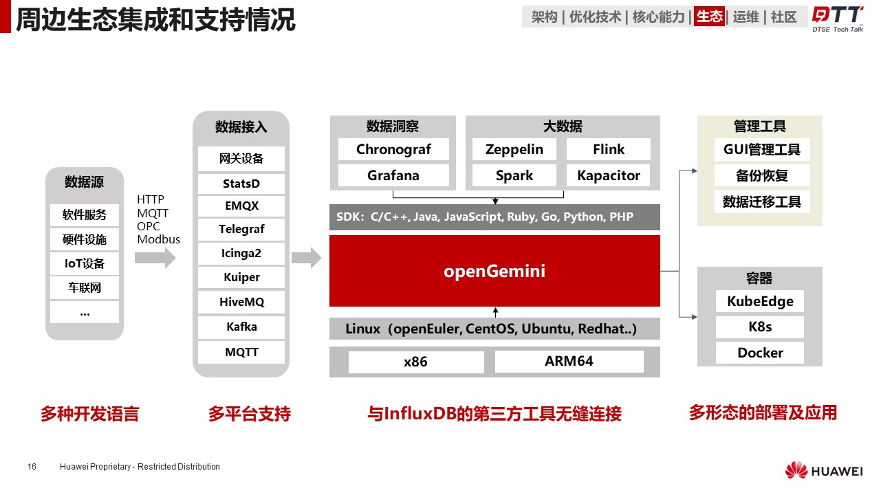 总结起来,openGemini支持多种主流开发语言和操作系统平台、与InfluxDB的第三方工具无缝衔接、支持多形态的部署及应用。