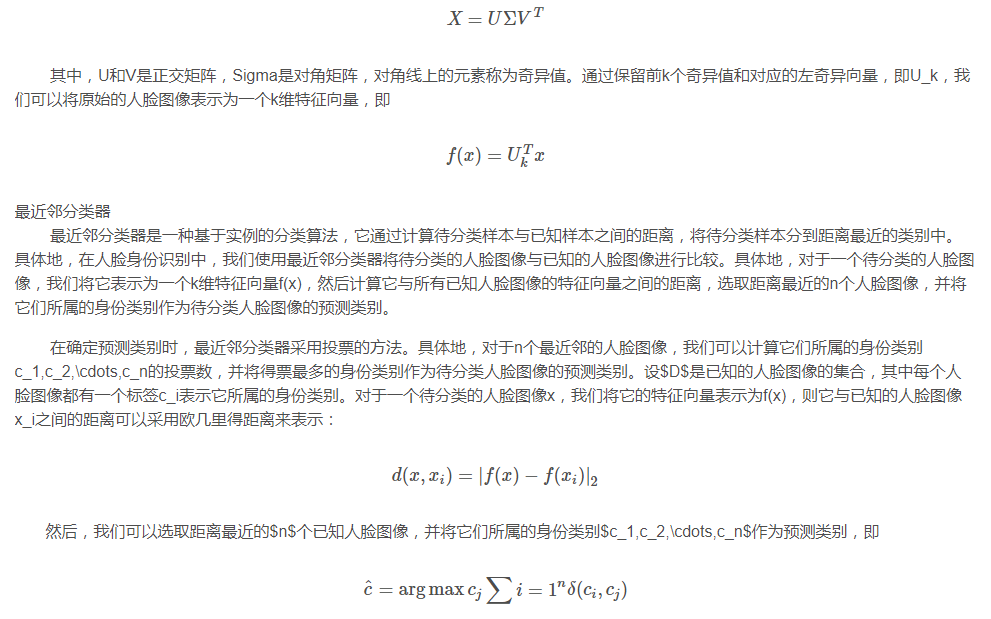 人脸身份识别算法的第一步是对人脸图像进行特征提取,将人脸图像转化为特征向量。常用的特征提取方法包括主成分分析(PCA)和线性判别分析(LDA)。在本文中,我们将使用SVD奇异值分解来提取人脸图像的特征向量。具体地,我们将人脸图像表示为一个矩阵X,其中每一列代表一张人脸图像,然后对X进行SVD分解,即
