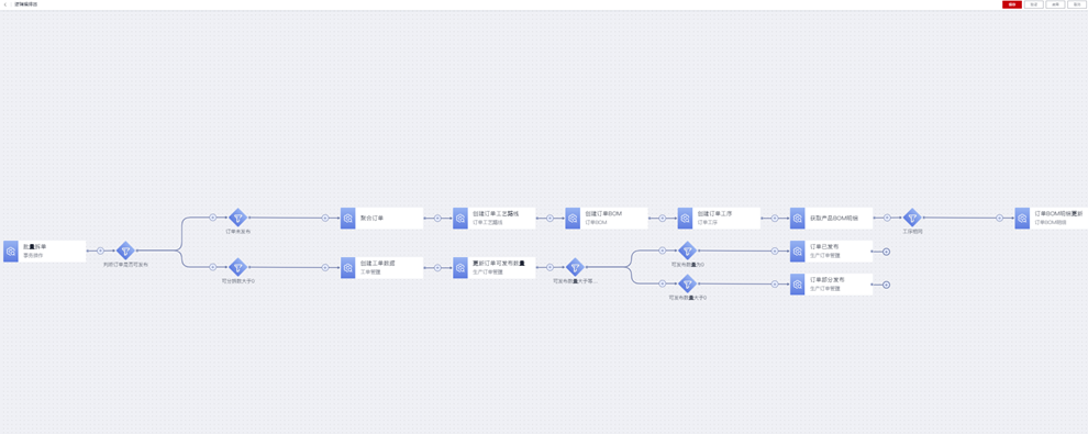 点击新增的“批量拆单”逻辑流程右侧操作栏的“配置”操作,进入“逻辑编排器”编排“批量拆单”的流程逻辑,最终编排的逻辑流程如下: