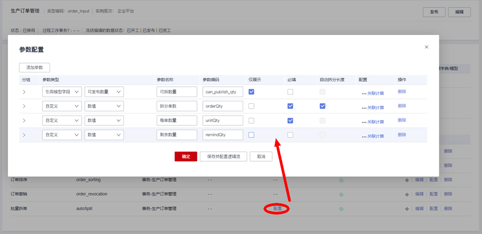 “批量拆单”操作,需要勾选“启用参数”,然后配置操作的参数字段,用来生成用户在执行“批量拆单”时需要录入的“拆分单数”、“每单数量”等参数信息: