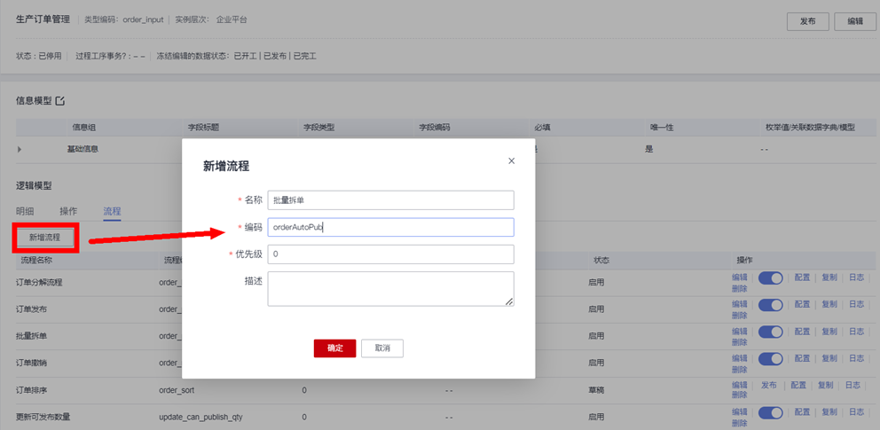 在用户操作的“参数配置”窗口可选择“保存并配置逻辑流”,自动创建相应的逻辑流程,也可以在“生产订单”事务模型“流程”页签下,手工新增逻辑流程“批量拆单”: