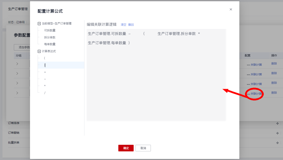 “剩余数量”:业务含义是显示本次拆单后,订单剩余的可执行数量,这里我们可以通过配置“关联计算”公式,来实现自动计算剩余数量=订单的可拆数量-拆分单数*每单数量: