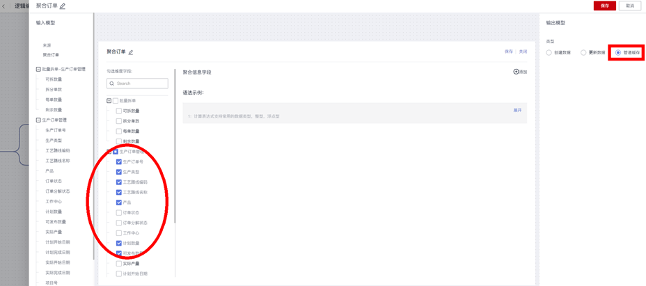 在创建订单BOM和订单工艺路线之前,因为“批量拆分”会根据“拆分单数”循环执行多次,需要先通过“聚合动作”回归到“生产订单”数据维度,保证一个订单只执行一次创建订单BOM和工艺路线,“聚合订单”动作的输出类型选择“管道缓存”,具体配置示例如下: