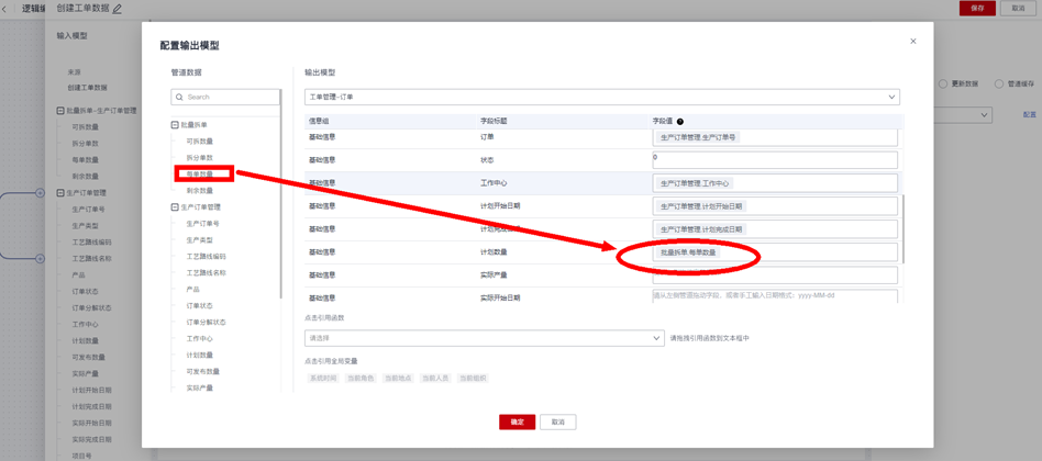 在华为云数字工厂企业平台的“建模工作台”,找到“生产订单”事务模型,扩展新增所需的“批量拆分”用户操作,然后使用“逻辑编排器”来编排“批量拆分”的流程逻辑,完成“批量拆分”所需的业务逻辑建模配置。