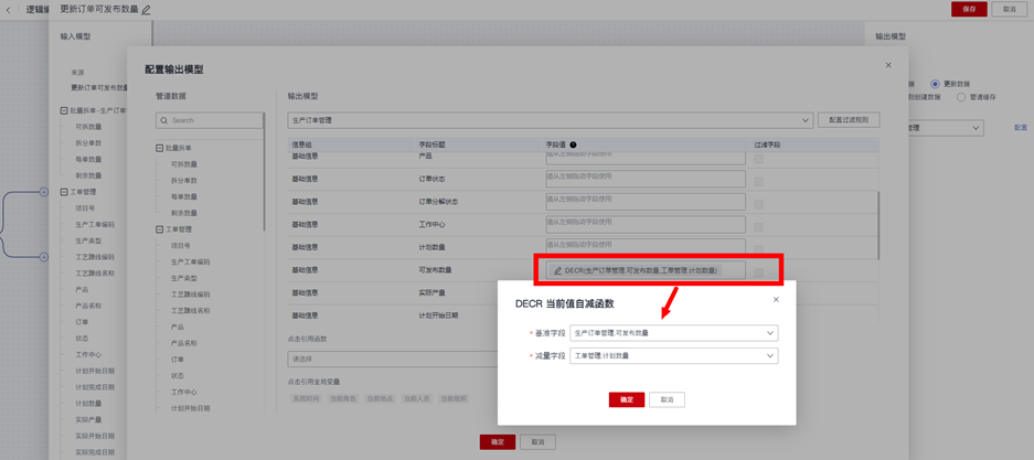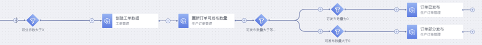 最后判断生产订单的可发布数量是否大于0,来决定更新生产订单的状态为“部分发布”还是“已发布”,生产订单拆分创建工单和更新订单数量状态的逻辑动作配置步骤如下,详细配置示例不再详细展开说明: