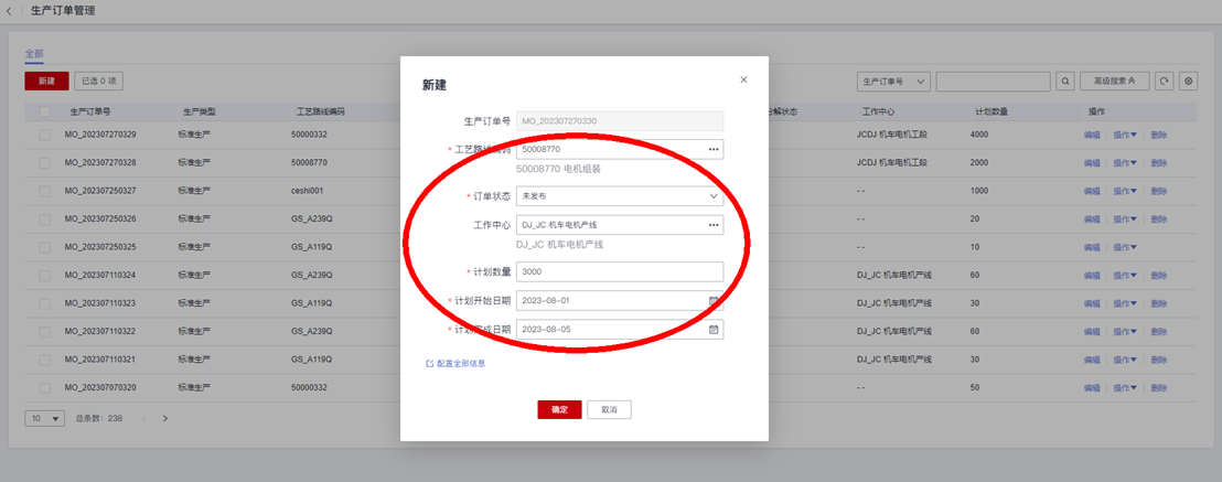 1.创建一个生产订单,录入工单的“产品工艺路线”和“计划数量”等字段信息,确定后创建生产订单数据: