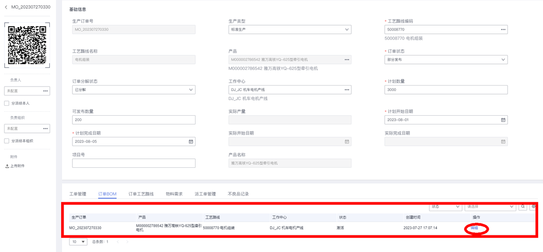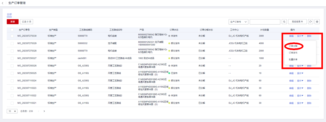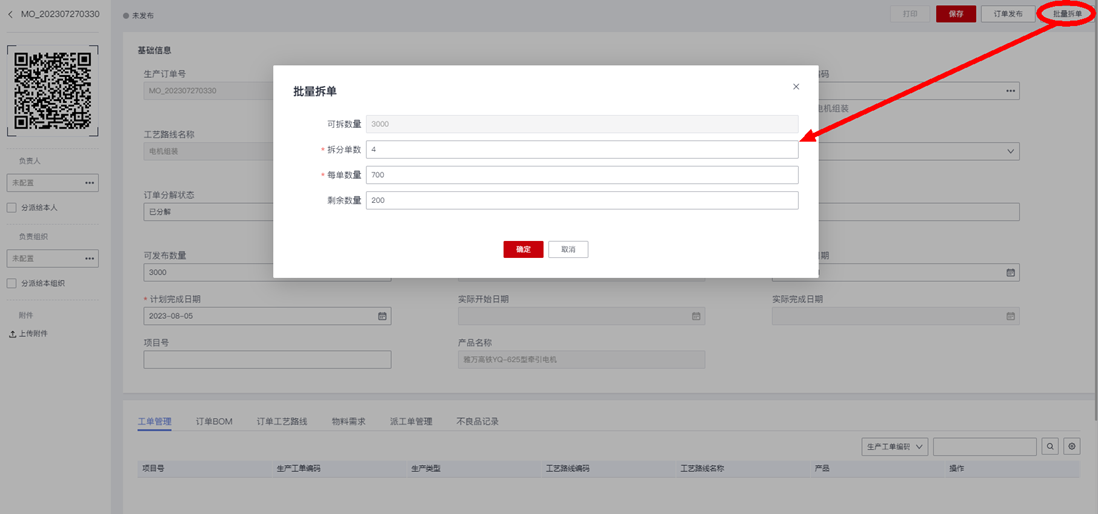 3.生产订单分解完成后,我们进入成品生产订单的详情编辑页面,执行“批量拆单”操作: