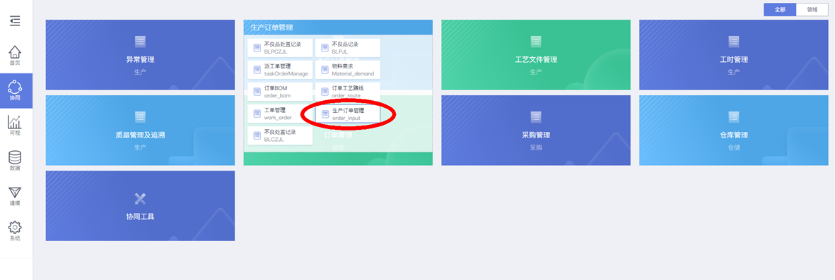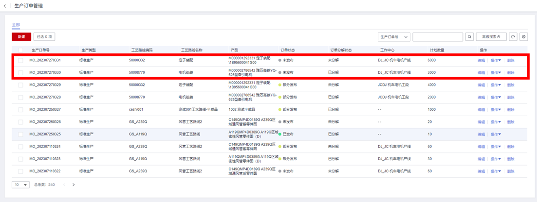 在华为云数字工厂企业平台“协同工作台”,使用“生产订单”功能实例,来验证“批量拆单”功能运行效果: