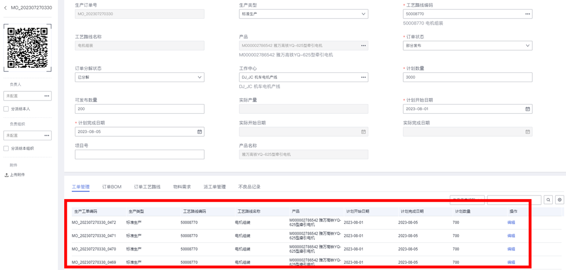 执行完成后,界面自动刷新,我们可以查看验证生产订单是否已根据成品BOM分解创建子装配件的生产订单:
