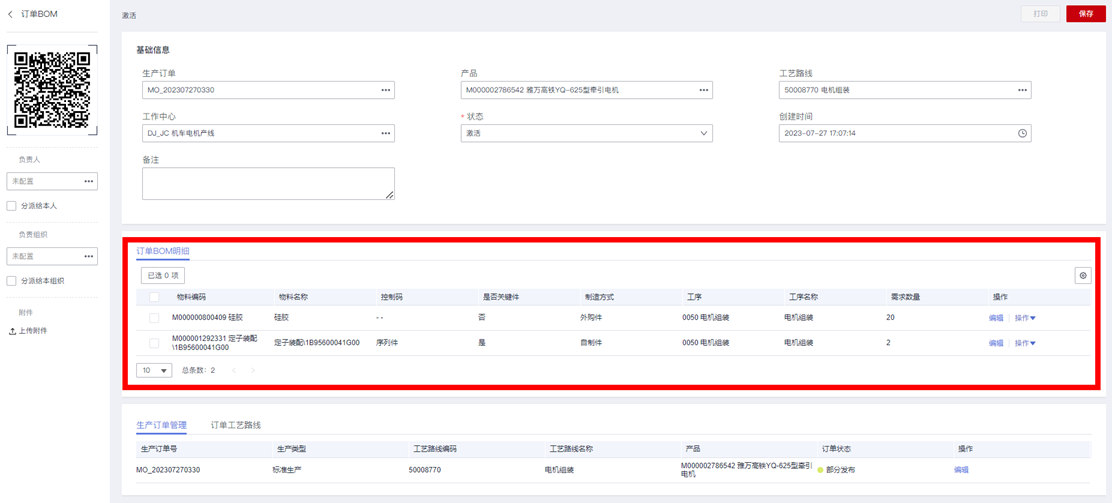 - 订单BOM明细: