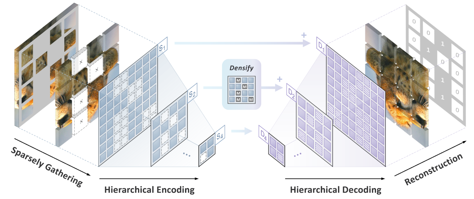 因此作者借鉴了3D点云领域的稀疏卷积,该卷积只对未mask的像素进行计算,忽略masked的像素,可以处理不规则的输入,实现了和ViT类似的效果。另外,为了学习到多尺度的特征,作者设计了分层次的解码器,参考了UNet的结构设计,使模型学习到多尺度的特征,适应CNN的多层级结构。